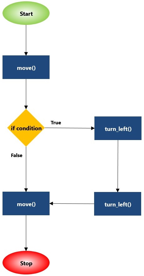 Dans le code ci-dessus, if, Vrai et Faux sont tous des mots-clés Python. C’est une bonne idée d’essayer le code ci-dessus dans le monde de Reeborg (vous pouvez utiliser n’importe quel monde, peut-être tout seul?). Vous pouvez également vouloir échanger les valeurs Vrai et Faux, puis réexécutez le programme pour voir ce qui se passe.